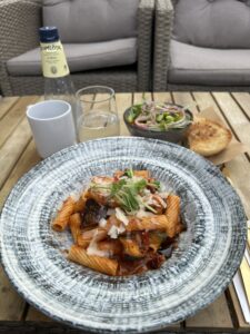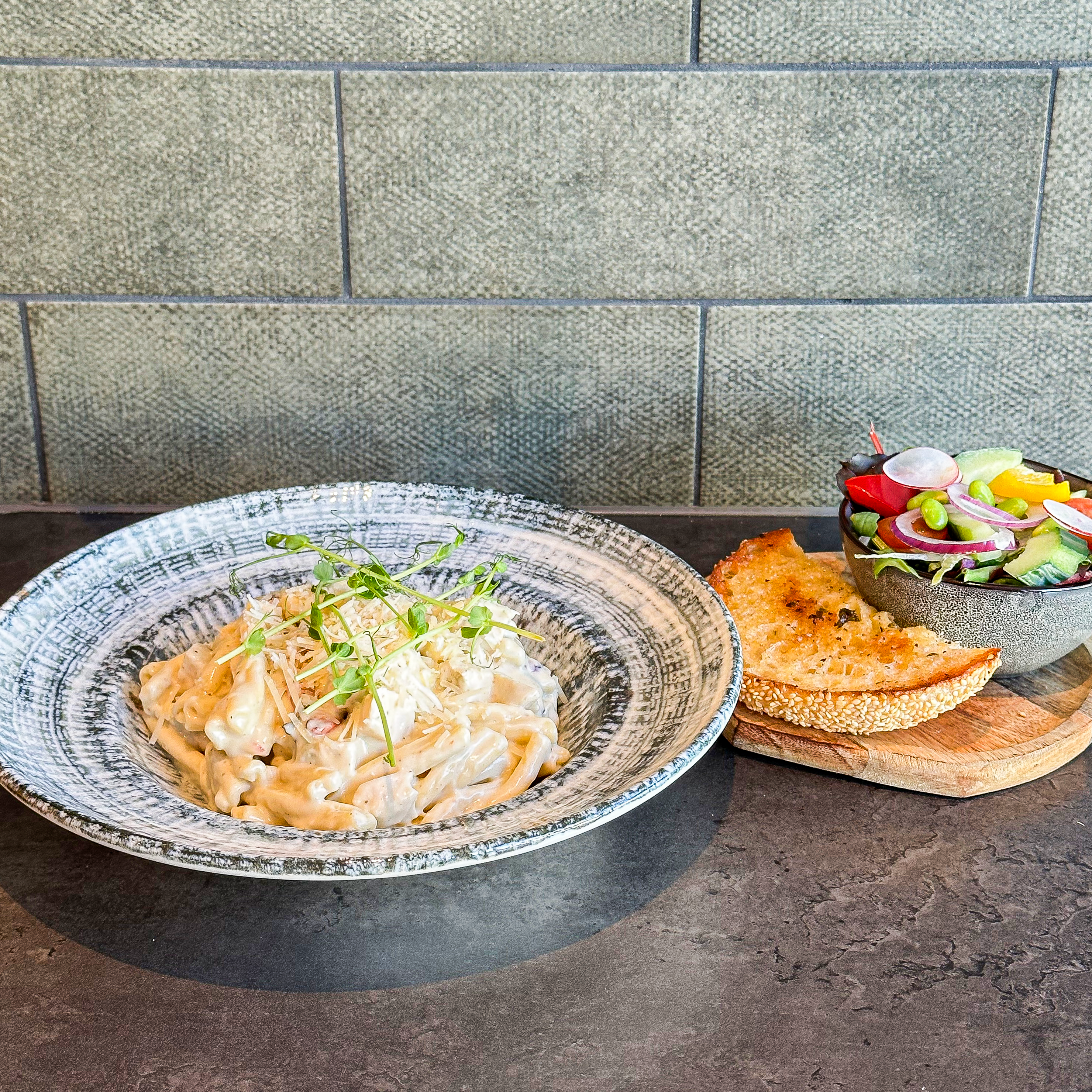 Krämig kycklingpasta – nykokt pasta omsorgsfullt blandad i vår lena och smakrika béchamelsås gjord på äkta, färsk Roquefortost, tillsammans med saftiga bitar av kycklingbröst. Rätten toppas generöst med finriven parmesan för en extra smakrik touch. Serveras med en fräsch mixsallad och valfri dressing samt nygräddat vitlöksbröd. Vid avhämtning ingår även vårt rustika surdegsbröd – en perfekt kombination av krämighet och fräschör som mättar.