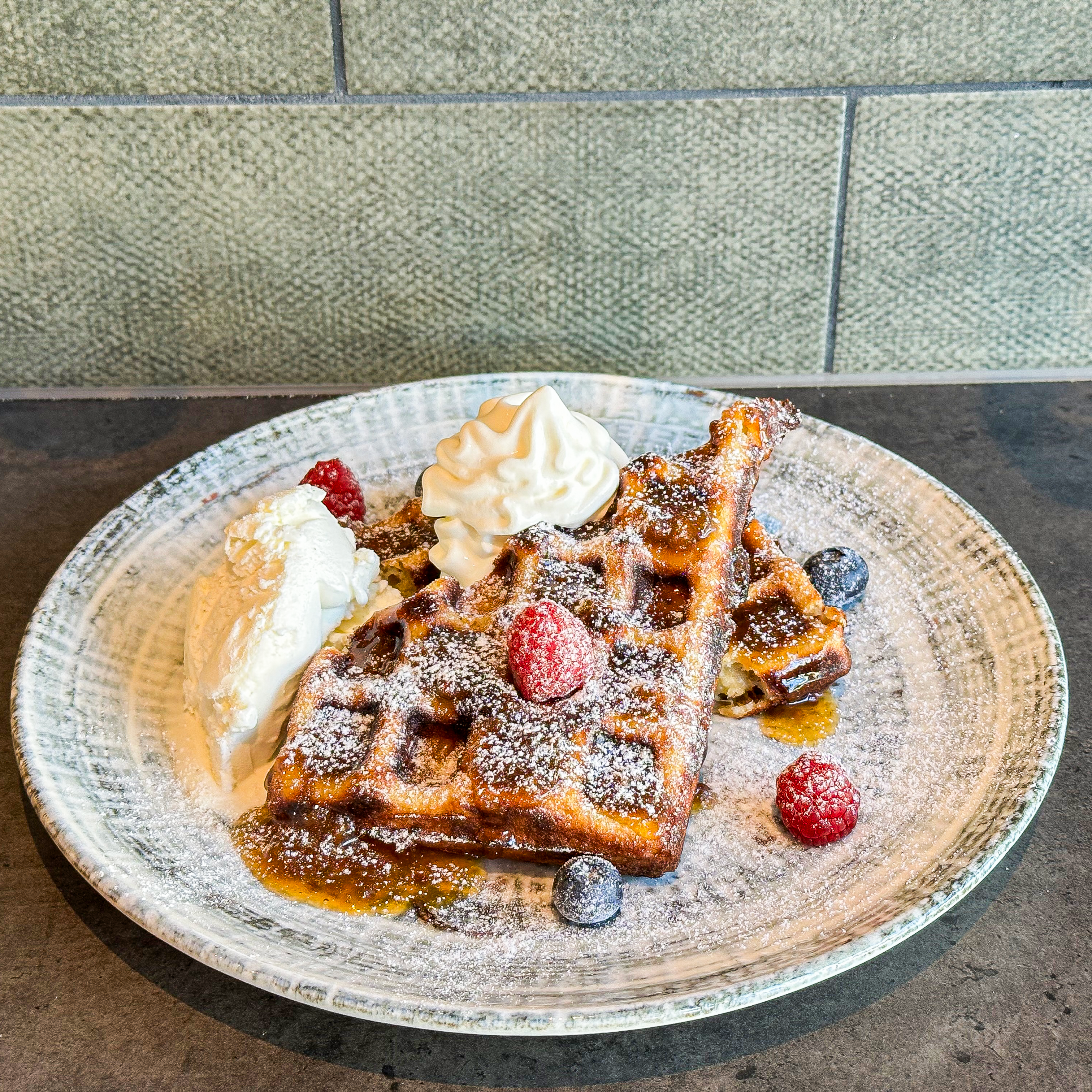 Belgisk nygräddad våffla – krispig och gyllene, toppad med vår hemgjorda Skagenröra gjord på handskalade räkor från Feldths på Smögen. Serveras tillsammans med en fräsch sallad som balanserar rätten perfekt – en lyxig och fräsch kombination som kittlar smaklökarna.