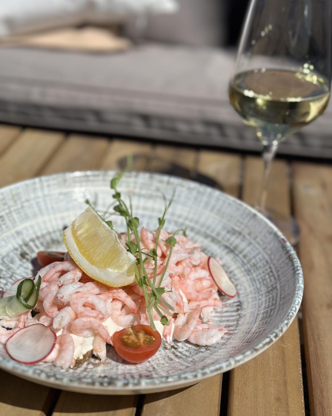 Vår ”lilla” räkmacka – en generös skål med 100 gram handskalade räkor från Feldths på Smögen, toppad med skivor av kokt ägg, krämig majonnäs och ett fräscht täcke av sallad, tomat, gurka och ärtskott. Smaksatt med dill och en fräsch citronklyfta som lyfter hela rätten. Serveras på vårt eget nybakade danska rågbröd – en klassiker som känns både lyxig och välbalanserad.