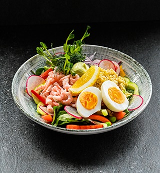 Fräsch räksallad med bulgur – generöst toppad med handskalade räkor och skivor av perfekt kokt ägg. En härlig salladsmix med saftiga cocktailtomater och krispig gurka ger fräschör och balans. Bulgur tillför mättnad och textur för en komplett måltid. Serveras med valfri dressing, nygräddat vitlöksbröd och vid avhämtning vårt rustika surdegsbröd – en lätt och smakrik favorit.