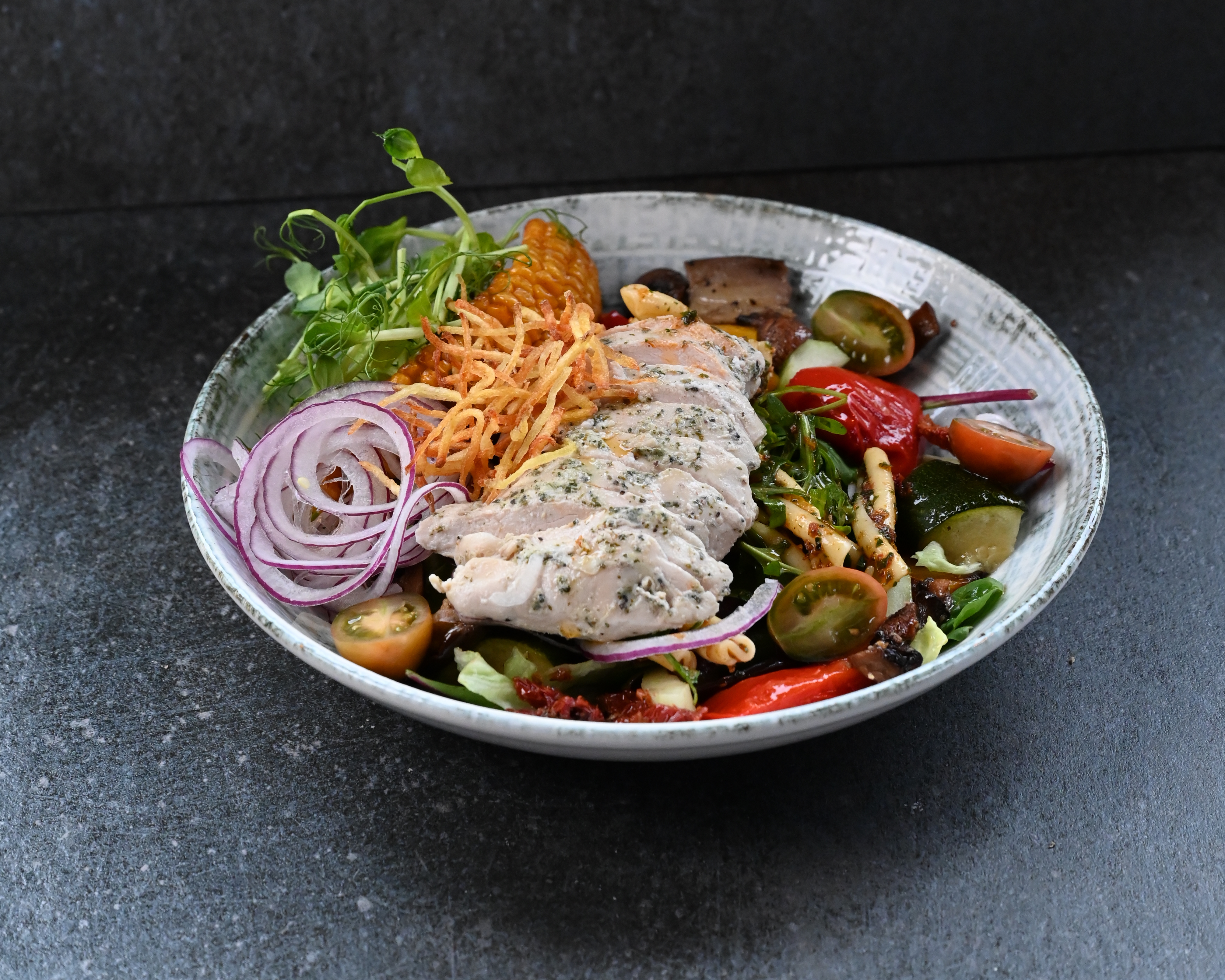 Salvia- & citrusmarinerat kycklingbröst med en färgstark mix av krispig sallad, ugnsrostad söt majs och saftig grillad paprika. Tillsammans med fräscha ärtskott, perfekt grillad zucchini och vitlöksfrästa champinjoner som ger djup och sälta. En smakrik, marinerad pastasallad och knapriga potatischips adderar både textur och mättnad. Serveras med valfri dressing för din personliga touch och nygräddat vitlöksbröd. Vid avhämtning ingår dessutom vårt rustika surdegsbröd – en komplett och smakrik måltid som både mättar och tillfredsställer.